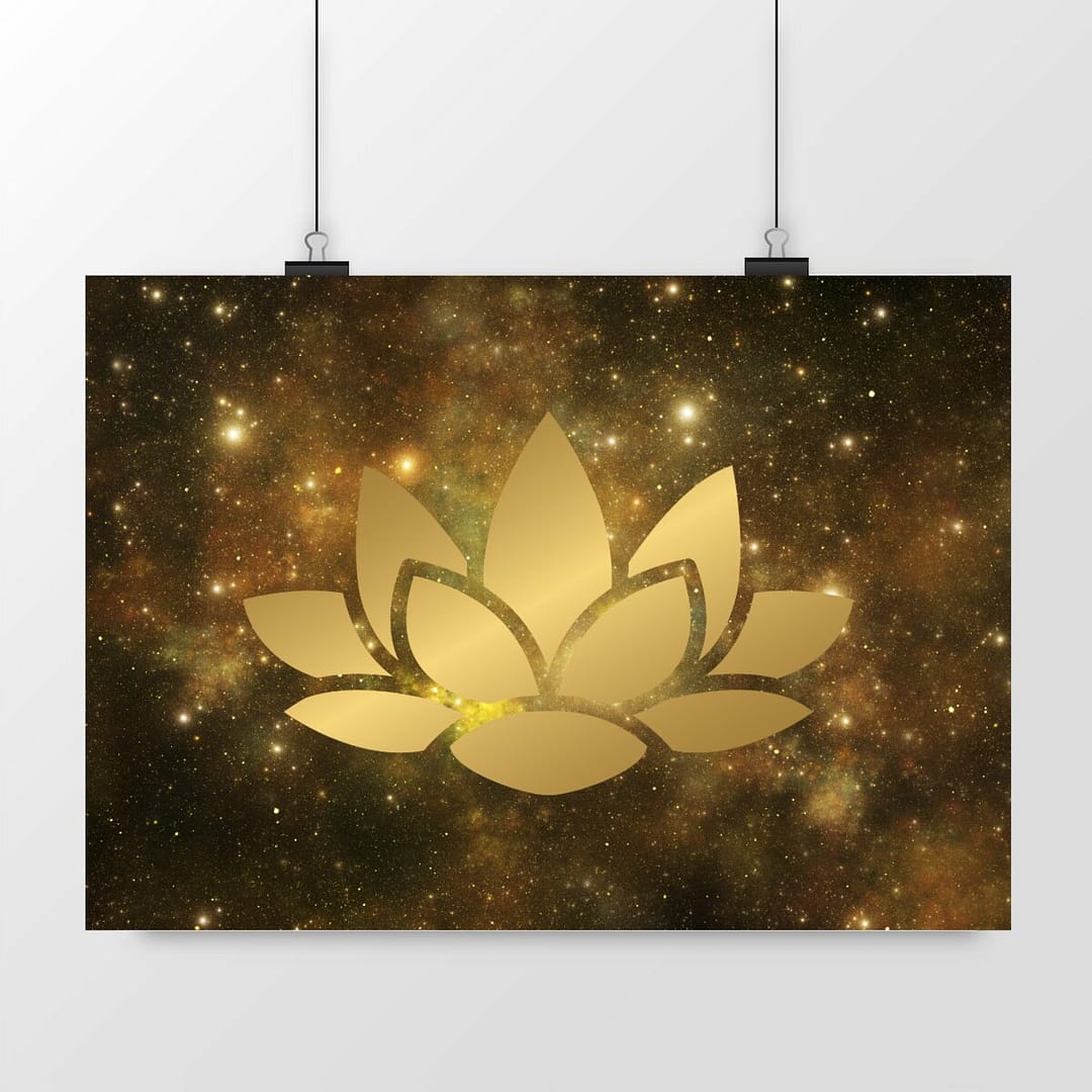 Transformez votre intérieur en un sanctuaire de beauté et de sérénité avec notre Affiche Fleur de Lotus en Or sur Fond Étoilé.